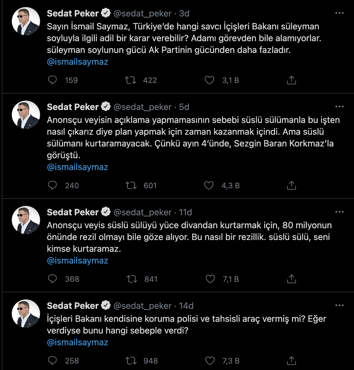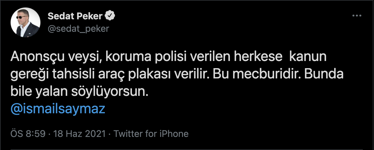 Peker, paylaşımında, ''İçişleri Bakanı kendisine koruma polisi ve tahsisli araç vermiş mi? Eğer verdiyse bunu hangi sebeple verdi?'' sorusunu sordu. Peker, ''Anonsçu Veyis, Süslü Sülü'yü yüce divandan kurtarmak için, 80 milyonun önünde rezil olmayı bile göze alıyor. Bu nasıl bir rezillik. süslü sülü, seni kimse kurtaramaz'' diye yazdı.