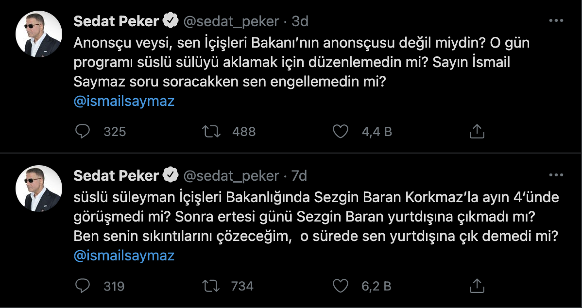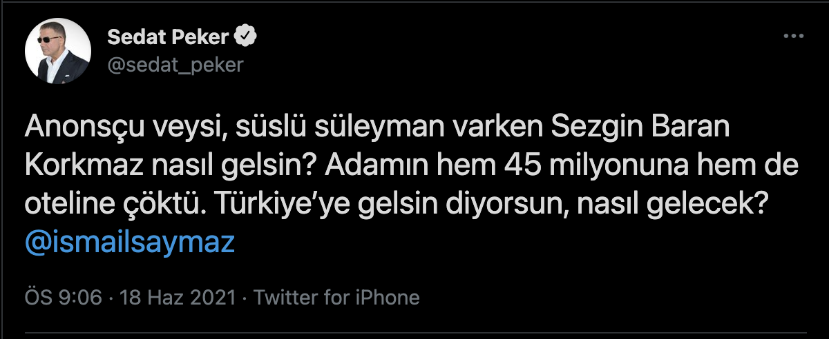 Organize suç örgütü lideri Sedat Peker, Veyis Ateş'in Sezgin Baran Korkmaz'dan 10 milyon euro aldığı iddialarını Halk TV'de yanıtladığı sırada; Twitter hesabından paylaşımlarda bulundu. Sedat Peker, "Anonsçu Veysi, Süslü Süleyman varken Sezgin Baran Korkmaz nasıl gelsin? Adamın hem 45 milyonuna hem de oteline çöktü. Türkiye’ye gelsin diyorsun, nasıl gelecek?" ifadelerini kullandı.