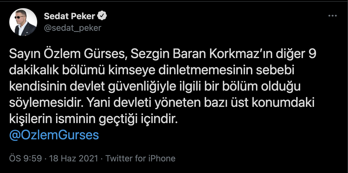 Peker ayrıca, gazeteci Özlem Gürses'i etiketleyerek, SBK'nın videonun tamamını dinletmemesinin sebebinin devlet güvenliğini ilgilendiren bir bölümün yer alması olduğunu söyledi. Peker, "Sayın Özlem Gürses, Sezgin Baran Korkmaz’ın diğer 9 dakikalık bölümü kimseye dinletmemesinin sebebi kendisinin devlet güvenliğiyle ilgili bir bölüm olduğu söylemesidir. Yani devleti yöneten bazı üst konumdaki kişilerin isminin geçtiği içindir" ifadelerini kullandı.