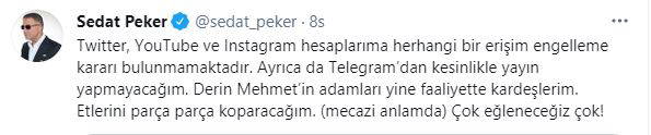 “Twitter, YouTube ve Instagram hesaplarıma herhangi bir erişim engelleme kararı bulunmamaktadır. Ayrıca da Telegram’dan kesinlikle yayın yapmayacağım. Derin Mehmet’in adamları yine faaliyette kardeşlerim. Etlerini parça parça koparacağım. (mecazi anlamda) Çok eğleneceğiz çok!”