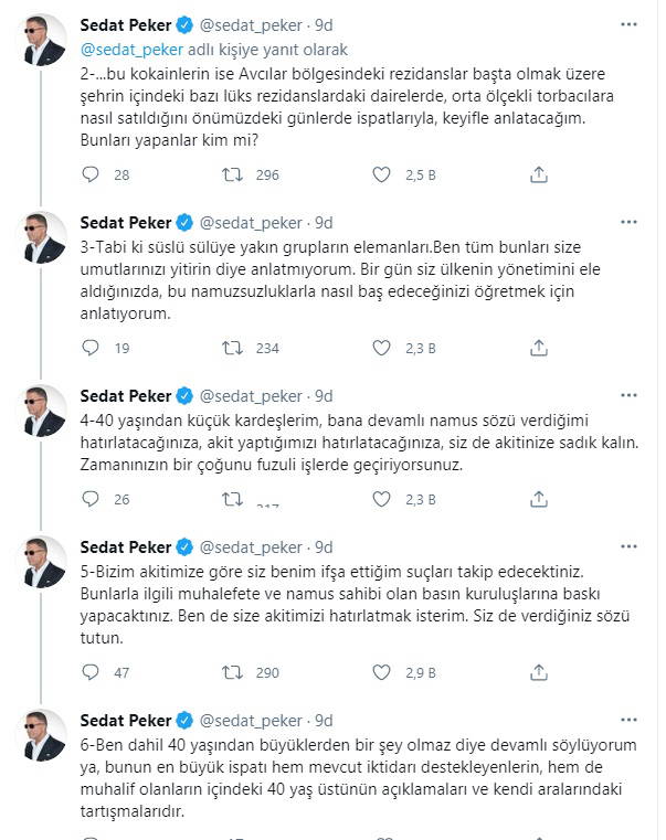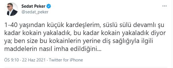 Peker, paylaşımında İçişleri Bakanı Süleyman Soylu'yu hedef alarak, "Devamlı şu kadar kokain yakaladık, bu kadar kokain yakaladık diyor ya; ben size bu kokainlerin yerine diş sağlığıyla ilgili maddelerin nasıl imha edildiğini bu kokainlerin ise Avcılar bölgesindeki rezidanslar başta olmak üzere şehrin içindeki bazı lüks rezidanslardaki dairelerde, orta ölçekli torbacılara nasıl satıldığını önümüzdeki günlerde ispatlarıyla, keyifle anlatacağım" dedi.