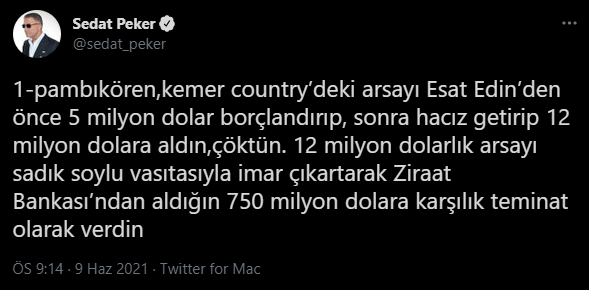 Yayımladığı videolardaki iddialarla gündeme gelen organize suç örgütü lideri Sedat Peker, son olarak sosyal medya hesabı Twitter'dan yeni iddialarda bulundu.