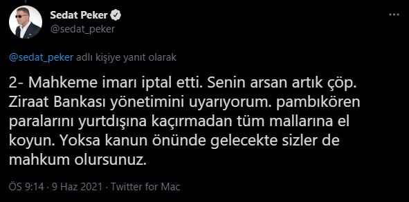 "Ziraat Bankası yönetimini uyarıyorum" diyen Peker, "Demirören paralarını yurtdışına kaçırmadan tüm mallarına el koyun. Yoksa kanun önünde gelecekte sizler de mahkum olursunuz" ifadelerini kullandı.