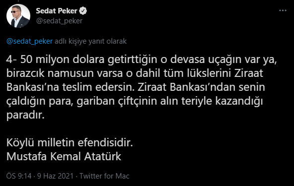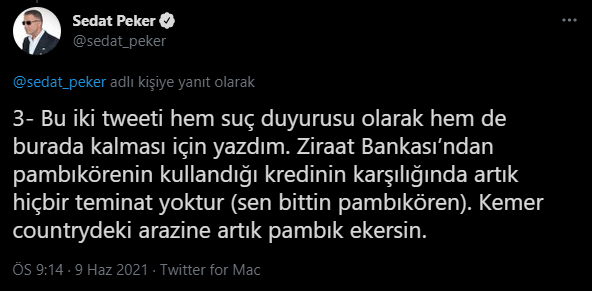 Demirören Medya'nın, Doğan Medya Grubu'nun 2018 yılındaki satışında Ziraat Bankası'ndan aldığı 750 milyon dolarlık krediyi ödemediğini öne süren Peker, yeni paylaşımlarında Ziraat Bankası yönetimine seslendi.