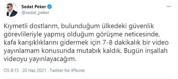 "Bugün inşallah videoyu yayınlayacağım" diyen Peker'in Twitter hesabından yaptığı açıklama şöyle: