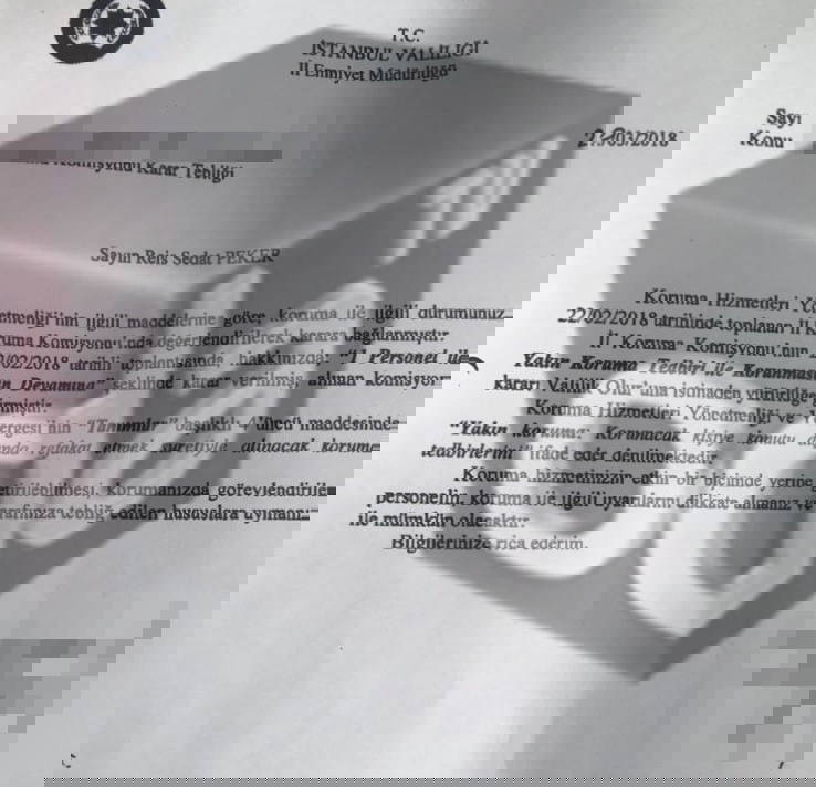İl Koruma Komisyonu’nun 22 Şubat 2018 tarihli toplantısında hakkınızda ‘1 (Bir) Personel ile Yakın Koruma tedbiri ile Korunmasının Devamına’ şeklinde karar verilmiş, alınan komisyon kararı Valilik ‘Olur’una istinaden yürürlüğe girmiştir.