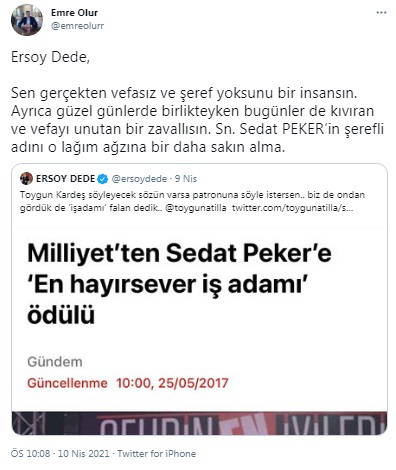 Ersoy Dede'ye "Sen gerçekten vefasız ve şeref yoksunu bir insansın. Ayrıca güzel günlerde birlikteyken bugünler de kıvıran ve vefayı unutan bir zavallısın" diye seslenen Olur, Dede'yi "Sn. Sedat PEKER’in şerefli adını o lağım ağzına bir daha sakın alma." diye uyardı.