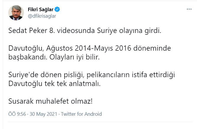 Peker'in bu açıklamalarının ardından Ahmet Davutoğlu çıkışı yapan CHP eski Milletvekili Fikri Sağlar, ''Sedat Peker 8. videosunda Suriye olayına girdi. Davutoğlu, Ağustos 2014-Mayıs 2016 döneminde başbakandı. Olayları iyi bilir. Suriye'de dönen pisliği, pelikancıların istifa ettirdiği Davutoğlu tek tek anlatmalı. Susarak muhalefet olmaz'' ifadelerini kullandı.