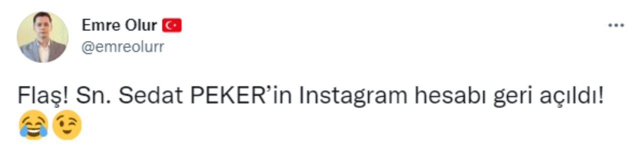 Olur, paylaşımında; "Sn. Sedat PEKER’in Instagram hesabı geri açıldı!" ifadelerini kullandı.