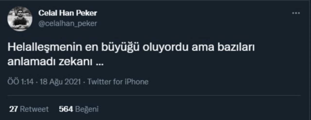 Celal Han Peker, Twitter'dan yaptığı paylaşımında "Helalleşmenin en büyüğü oluyordu ama bazıları anlamadı zekanı…" ifadelerini kullandı.