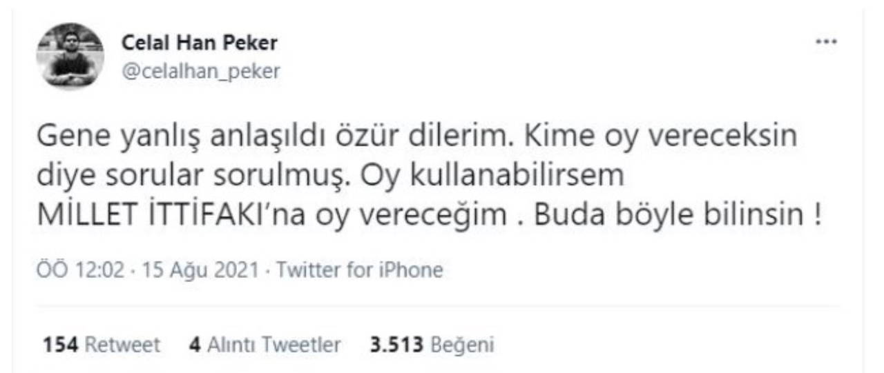 Peker, önceki paylaşımında ise "Gene yanlış anlaşıldı özür dilerim. Kime oy vereceksin diye sorular sorulmuş. Oy kullanabilirsem Millet İttifakı'na oy vereceğim. Bu da böyle bilinsin!" demişti.
