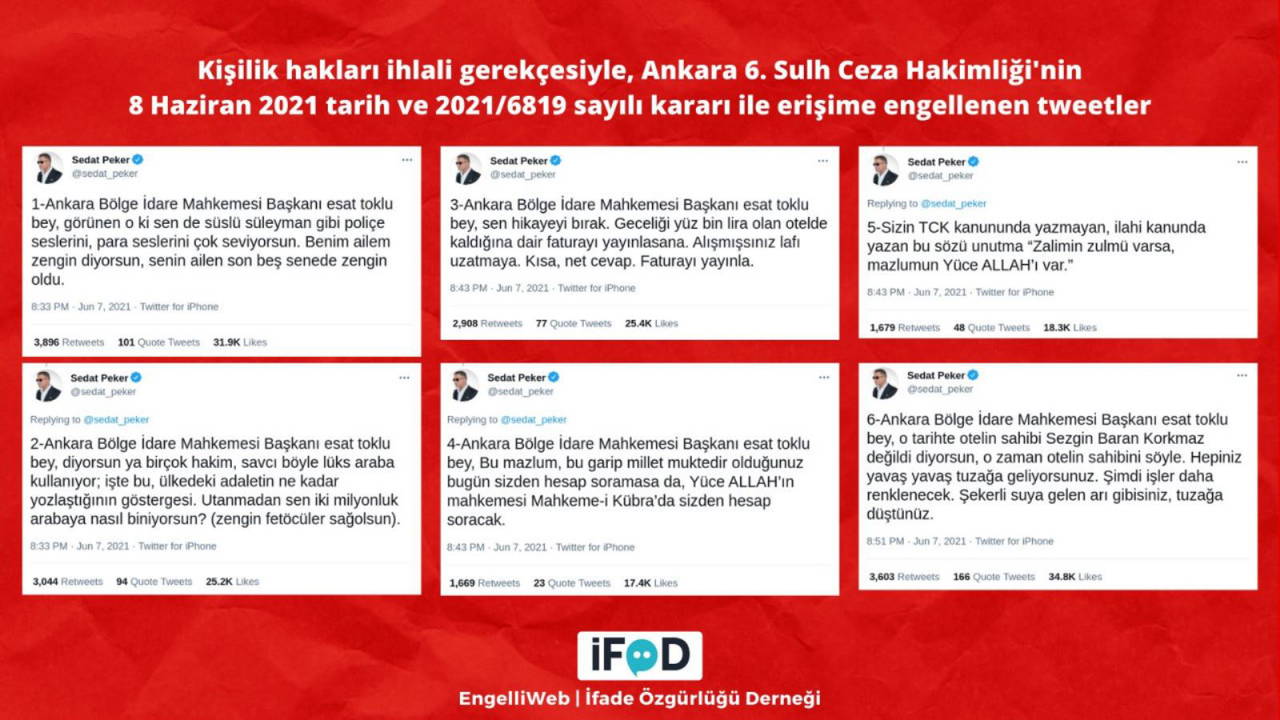 Ankara Bölge İdare Mahkemesi Başkanı Esat Toklu ile ilgili iddialarda bulunan Peker’in 6 tweeti, kişilik hakları ihlali gerekçesiyle, Ankara 6. Sulh Ceza Hakimliği‘nin 8 Haziran 2021 tarih ve 2021/6819 sayılı kararı ile erişime engellendi.