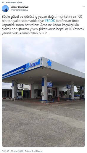 Twitter hesabı üzerinden açıklamalarda bulunan Ekşioğlu, sahibi olduğu Lazoil'in (Ekşioğlu Akaryakıt Ürünleri A.Ş) EPDK tarafından kapatıldığını duyurdu.