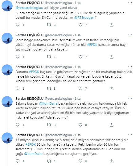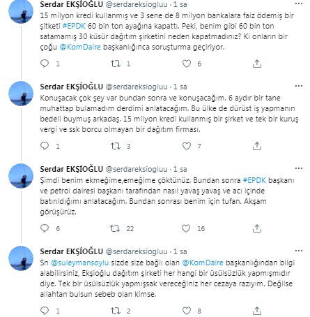 "Konuşacak çok şey var bundan sonra ve konuşacağım. 6 aydır bir tane muhattap bulamadım derdimi anlatacağım." diyen Ekşioğlu, "Şimdi benim ekmeğime, emeğime çöktünüz. Bundan sonra #EPDK başkanı ve petrol dairesi başkanı tarafından nasıl yavaş yavaş ve acı içinde batırıldığımı anlatacağım. Bundan sonrası benim için tufan. Akşam görüşürüz" ifadelerini kullandı.
