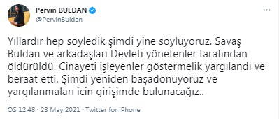 "Yıllardır hep söyledik şimdi yine söylüyoruz. Savaş Buldan ve arkadaşları Devleti yönetenler tarafından öldürüldü. Cinayeti işleyenler göstermelik yargılandı ve beraat etti. Şimdi yeniden başa dönüyoruz ve yargılanmaları için girişimde bulunacağız."