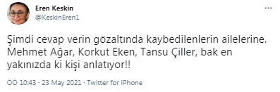 Peker'in iddiası sonrası İHD Eş Genel Başkanı Eren Keskin de kısa bir açıklama yaptı. Keskin, "Şimdi cevap verin gözaltında kaybedilenlerin ailelerine. Mehmet Ağar, Korkut Eken, Tansu Çiller, bak en yakınızda ki kişi anlatıyor!!" ifadelerini kullandı.