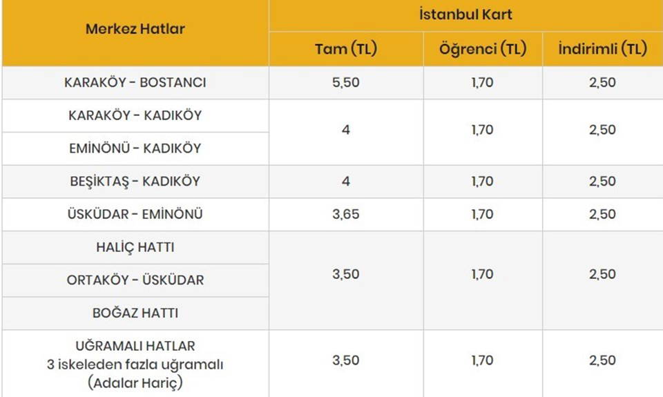 Adalar seferinin muaf tutulduğu uygulamada indirim yapılacak hatlar; Üsküdar-Eminönü, Kadıköy-Eminönü, Kadıköy-Karaköy, Kadıköy-Beşiktaş ve 3 iskeleden fazla uğramalı hatlar olarak açıklandı.