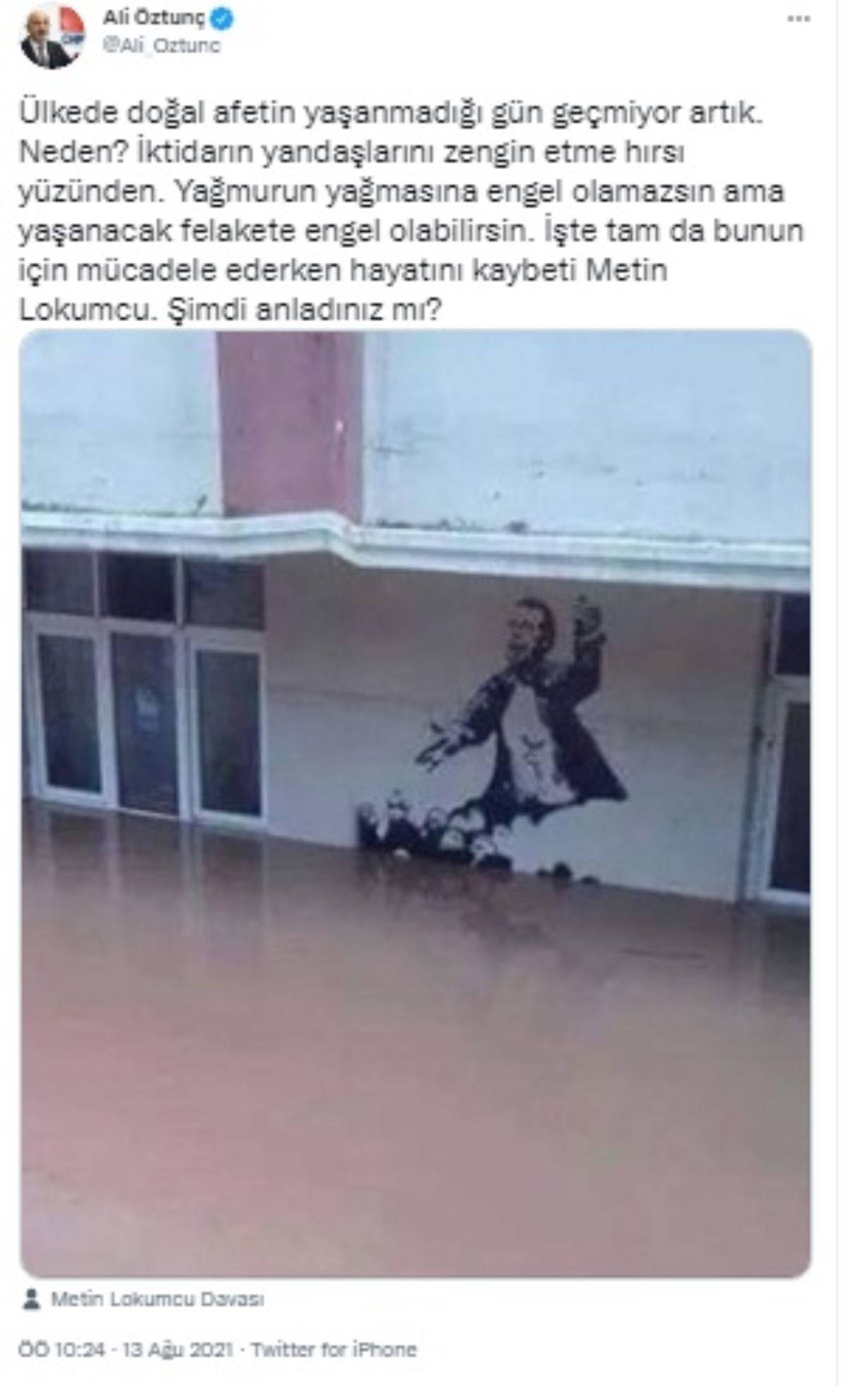 "Ülkede doğal afetin yaşanmadığı gün geçmiyor artık. Neden? İktidarın yandaşlarını zengin etme hırsı yüzünden. Yağmurun yağmasına engel olamazsın ama yaşanacak felakete engel olabilirsin. İşte tam da bunun için mücadele ederken hayatını kaybeti Metin Lokumcu. Şimdi anladınız mı?"