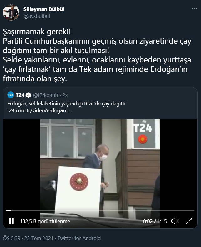 Erdoğan, sel felaketi yaşanan Rİze'deki ziyaretinde dah önce de yaptığı gibi otobüsten çay dağıttı. Erdoğan'ın çay dağıttığı anlara ait görüntülere tepki CHP'li Süleyman Bülbül'den geldi.
