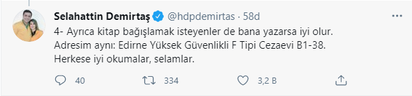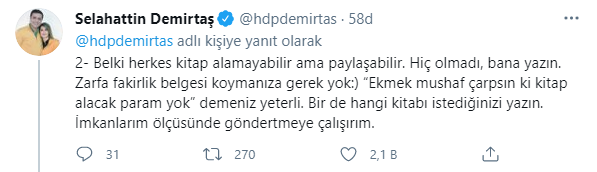 Edirne F Tipi Cezaevi'nde tutuklu bulunan HDP eski Eş Genel Başkanı Selahattin Demirtaş, Twitter hesabından kitap önerisinde bulundu. "Belki herkes kitap alamayabilir ama paylaşabilir. Hiç olmadı, bana yazın, “Ekmek mushaf çarpsın ki kitap alacak param yok” demeniz yeterli" diyen Demirtaş imkanları dahilinde göndermeye çalışacağını belirtti.