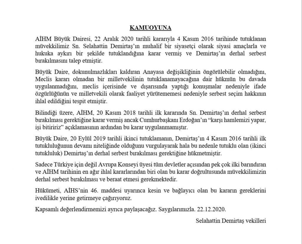 Yapılan açıklamada, “AİHM, Demirtaş’ın derhal bırakılması gerektiğine hükmetmiştir. Sadece Türkiye için değil Avrupa Konseyi üyesi tüm devletler açısından pek çok ilki barındıran ve AİHM tarihinin en ağır ihlal kararlarından biri olan bu karar doğrultusunda müvekkilimizin derhal serbest bırakılması ve beraat etmesi gerekmektedir. Hükümeti kararın gerekliliklerini ivedilikle yerine getirmeye çağırıyoruz” denildi.