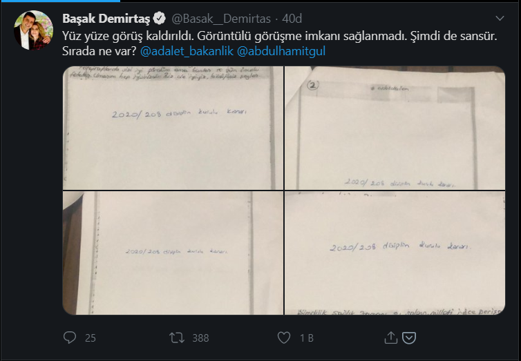 Başak Demirtaş’ın paylaştığı fotoğraflarda sansürlenen sayfaların üzerinde, “2020/208 Disiplin Kurulu” ifadesi yer aldı. Bu sayfaların sansürden kurtulan bölümlerinde ise Selahattin Demirtaş’ın, “Fotoğraflarda sizi iyi gördüm ama bunlar 10 gün önceki fotolar. Umarım hep iyisinizdir. Biz de iyiyiz, bildiğiniz şeyler” ve “Şimdilik sağlık zamanı, şu salgın, milleti iyice perişan etmeden sonlansa herkes rahat bir nefes alacak” ifadeleri yer aldı.