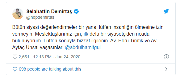 Bütün siyasi değerlendirmeler bir yana, lütfen insanlığın ölmesine izin vermeyin. Meslektaşlarımız için, ilk defa bir siyasetçiden ricada bulunuyorum. Lütfen konuyla bizzat ilgilenin. Av. Ebru Timtik ve Av. Aytaç Ünsal yaşasınlar.