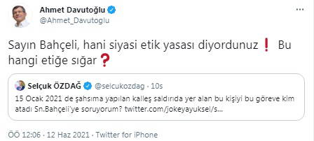 Gelecek Partisi Genel Başkanı Ahmet Davutoğlu da Özdağ'ın paylaşımını alıntılarak MHP lideri Devlet Bahçeli'ye tepki gösterdi. Davutoğlu, Bahçeli'ye yönelik "Sayın Bahçeli, hani siyasi etik yasası diyordunuz? Bu hangi etiğe sığar?" ifadelerini kullandı.