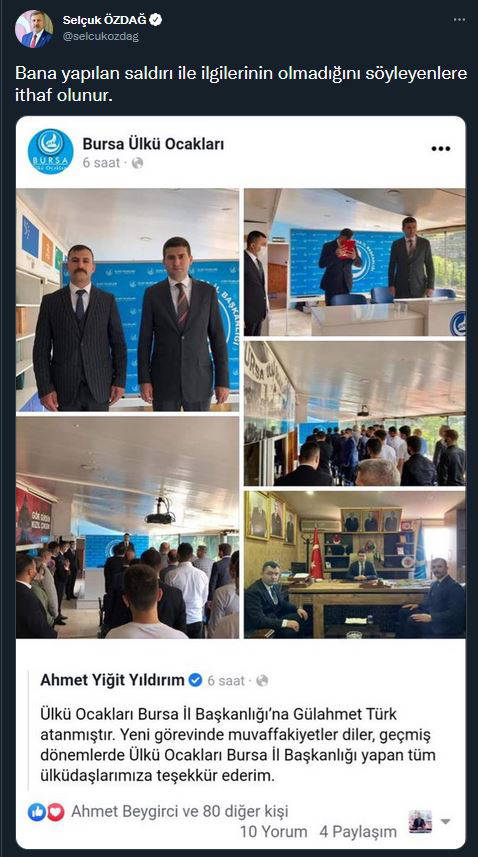 Bu karara tepki gösteren Selçuk Özdağ, sosyal medya hesabından “Bana yapılan saldırı ile ilgilerinin olmadığını söyleyenlere ithaf olunur” diye yazarak Ülkü Ocaklarının açıklamasını paylaştı.