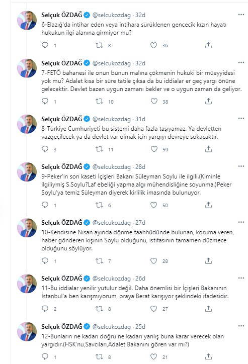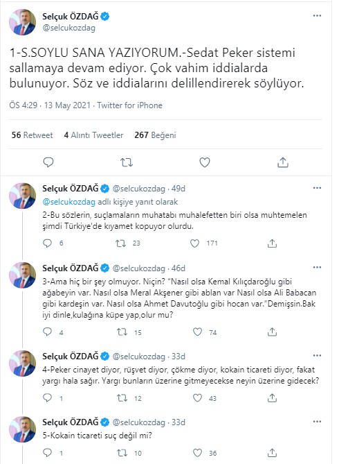 Gelecek Partisi Genel Başkan Yardımcısı Selçuk Özdağ, suç örgütü elebaşı Sedat Peker ve İçişleri Bakanı Süleyman Soylu arasındaki tartışmalara değindi. Sedat Peker'in iddialarının yargı mensuplarınca neden dikkate alınmadığını aktaran Özdağ, "Süleyman Soylu, sana yazıyorum" diyerek Soylu'ya seslendi.