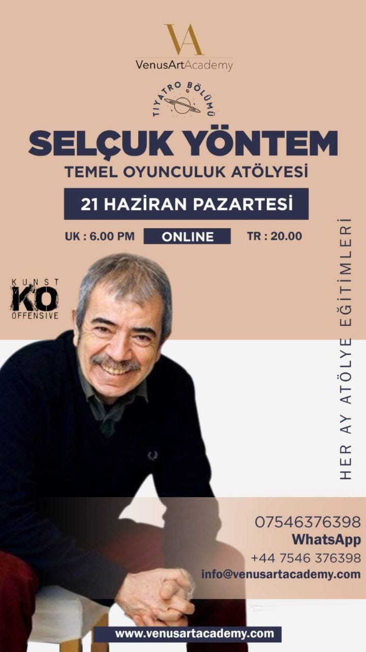 Usta oyuncu Selçuk Yöntem, merkezi Londra’da bulunan VenusArt Academy Tiyatro Bölümünde çevrimiçi ders verecek. Temel oyunculuk atölyesine çevrimiçi olarak herkes katılabilecek.