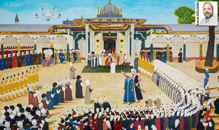 Halil Altındere’nin, Kapıdağlı Konstantin tarafından yapılan ünlü “Sultan 3. Selim’in Cülus Töreni” başlıklı tablosunu (1789) minyatür tarzında yeniden yorumladığı ve adını da “Sultanın Drone’lu Cülus Töreni” koyduğu işinde, sarayın avlusunda selfie çeken şehzadeler ve Fatih Sultan Mehmet’in portresini taşıyan bir drone dikkat çeken ilk ayrıntılar.