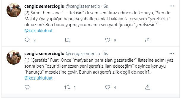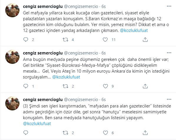 Semercioğlu, kendisini suçlayan Kozluklu'ya sosyal medyadan yeni bir yanıt verdi. Semercioğlu, "Şimdi sen işleri karıştırmadan, 'mafyadan para alan gazeteciler' listesinde adımı geçirdiğin için özür dile, gel sonra 'hanutçu' meselesini samimiyetle konuşalım. Ben sana medyada hanutçuluğun listesini yapayım" dedi.
