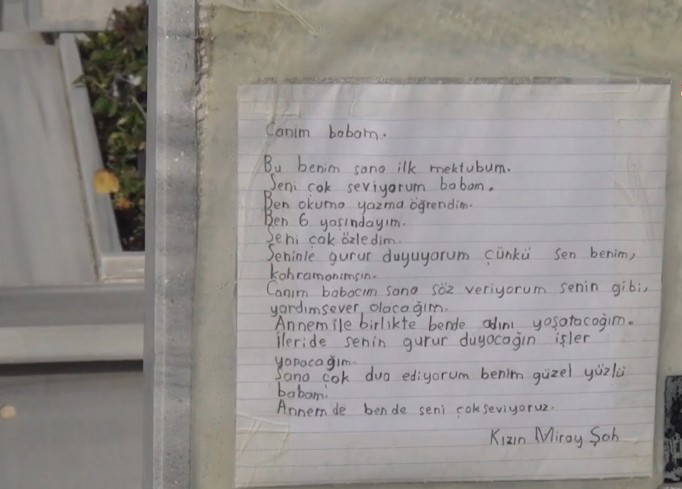"Canım Babam, seni çok seviyorum babam. Ben okuma yazmayı öğrendim. Ben 6 yaşındayım. Seni çok özledim. Seninle gurur duyuyorum çünkü sen benim kahramanımsın. Canım babacım, sana söz veriyorum senin gibi yardımsever olacağım. Annem ile birlikte ben de adını yaşatacağım. İleride senin gurur duyacağın işler yapacağım. Sana çok dua ediyorum benim güzel yüzlü babam. Annem de ben de seni çok seviyoruz. Kızın Mirayşah.”