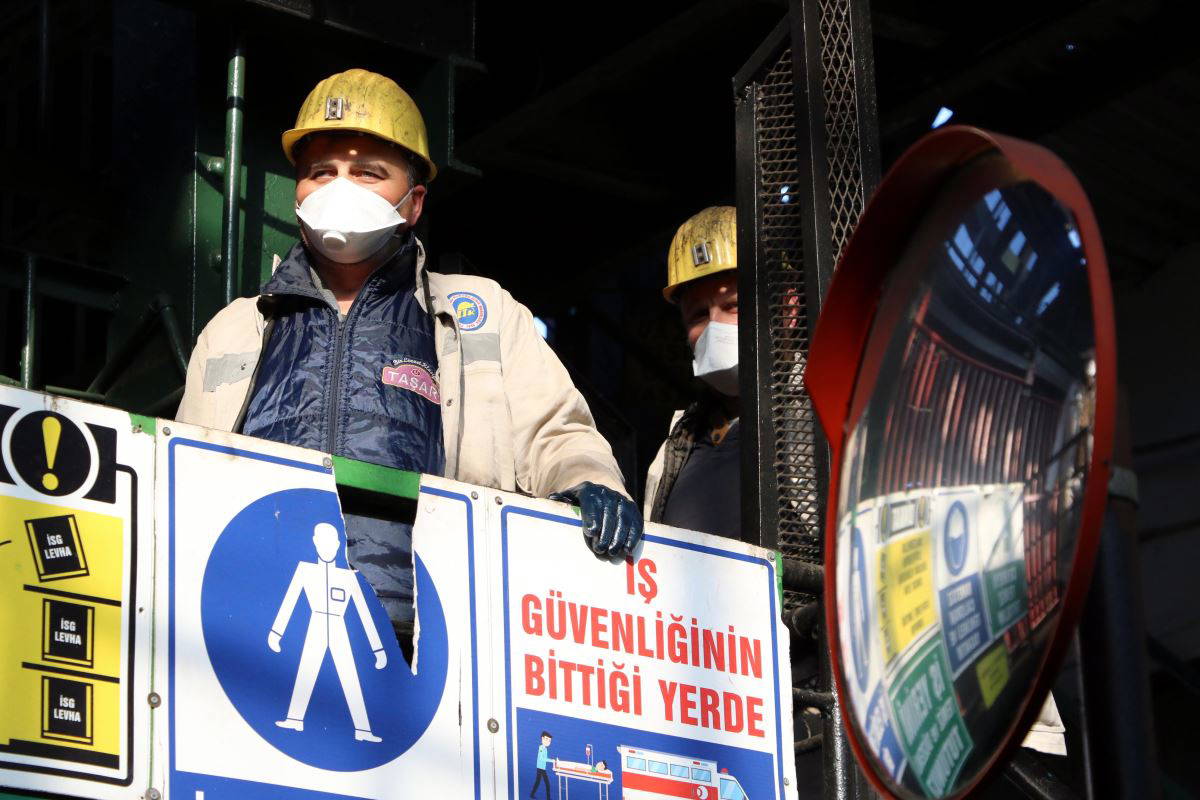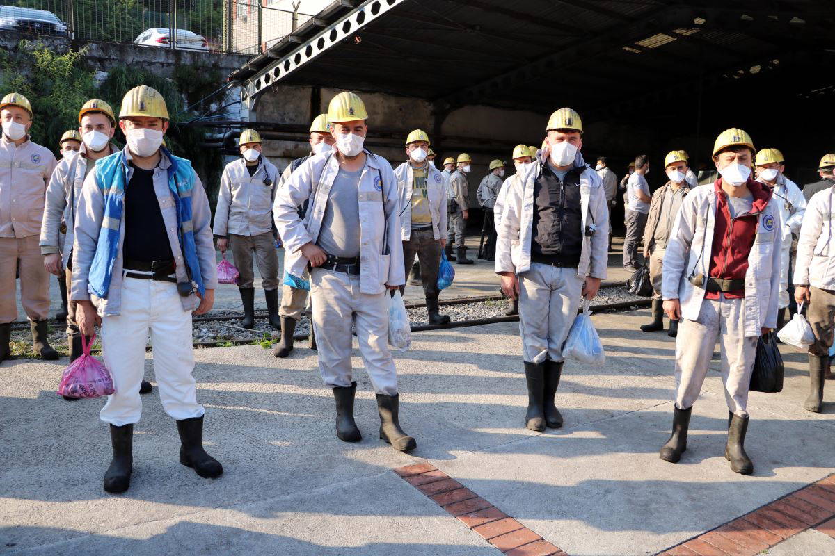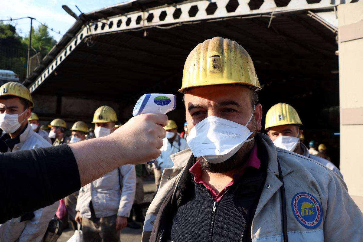 İşçiler mesaiye başlamadan önce ekipler tarafından ocak girişi ve iş yerleri dezenfekte edildi. TTK Üzülmez Müessese Müdürlüğü'ne bağlı maden ocağında ise sabah 08.00-16.00 vardiyası öncesi ocak önünde toplanan işçilerin ateşleri ölçüldü. İş yeri hekimi Dr. Metin Çelikiz tarafından işçilerin son kontrolleri yapıldı. Ardından ocak önünde sıraya giren işçiler, yeraltına inmek için kullanılan asansörlere sırayla ve sosyal mesafe kurallarıyla alındı. 40 kişilik asansörlere 20 işçi alınarak ocağa indirildi.