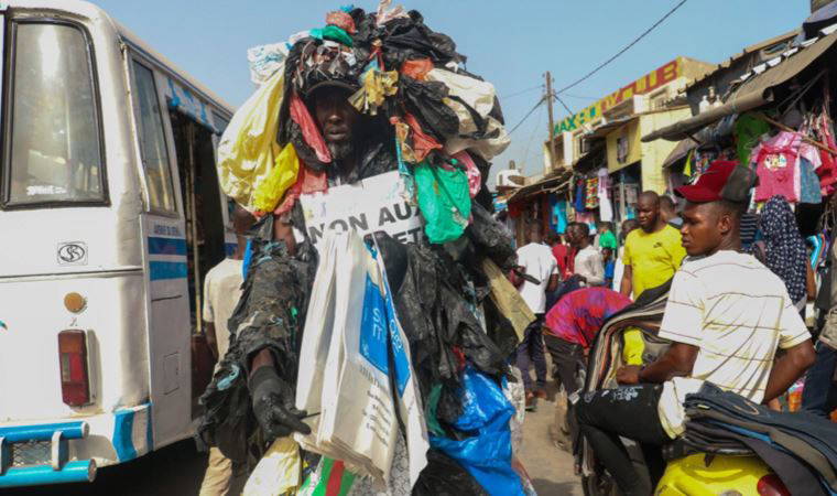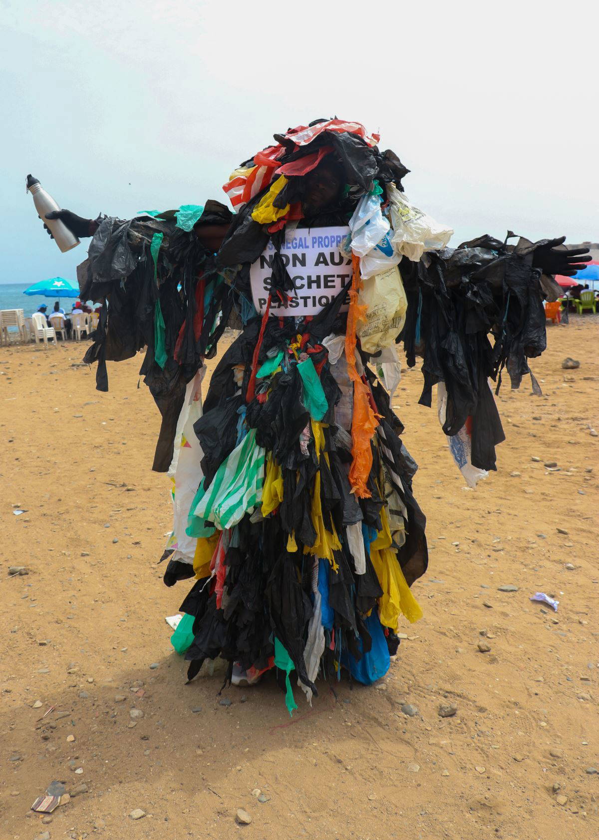 Senegalli çevre aktivisti Modou Fall, namıdiğer "Plastik Adam", yüzlerce poşetten oluşan kostümüyle başkent Dakar sokaklarında plastik atıklar konusunda farkındalık oluşturmak için çalışıyor.