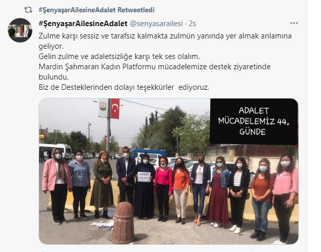 Sosyal medyadan açıklama yayımlayan Şenyaşar ailesi, önceki gün kendilerine destek ziyaretinde bulunan Mardin Şahmaran Kadın Platformu’na teşekkür ederek, çapıcı şu ifadeleri kullandı: