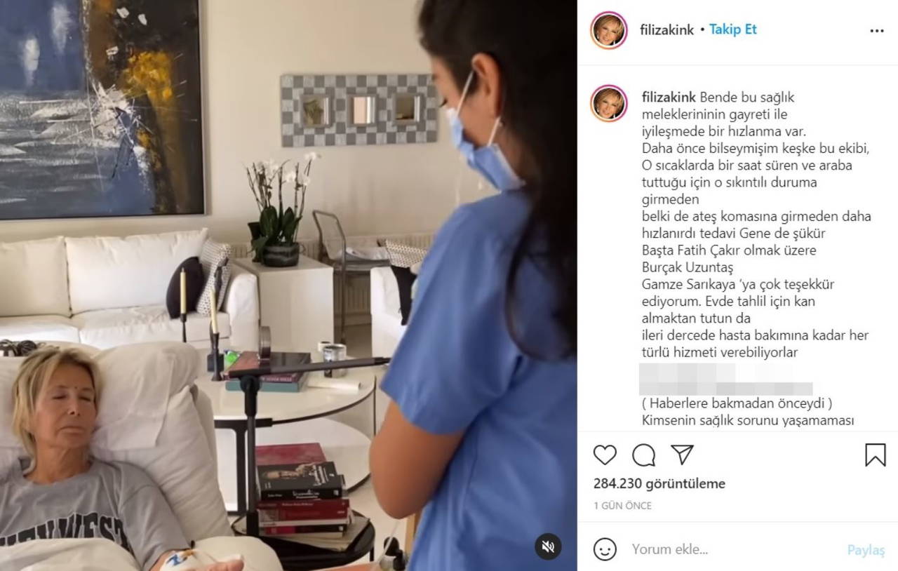 Son olarak sosyal medya hesabı Instagram'danbir gönderi yayımlayan Filiz Akın, tedavisini üstlenen sağlık çalışanlarına da teşekkür etti. Akın, "Bende bu sağlık meleklerinin gayretiyle iyileşmede bir hızlanma var. Daha önce bilseymişim keşke bu ekibi. Belki de ateş komasına girmeden daha hızlanırdı tedavi. Gene de şükür; başta Fatih Çakır olmak üzere Burçak Uzuntaş ve Gamze Sarıkaya'ya çok teşekkür ediyorum" dedi.
