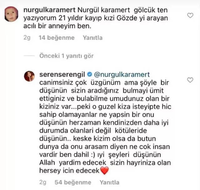 21 yıldır kayıp kızı Gözde’yi arayan Nurgül Karamert, Seren Serengil’in fotoğrafına yorum yaparak destek bekledi. Yorumu yanıtsız bırakmayan Seren Serengil’in sözleri ise bazı takipçileri tarafından eleştirildi.