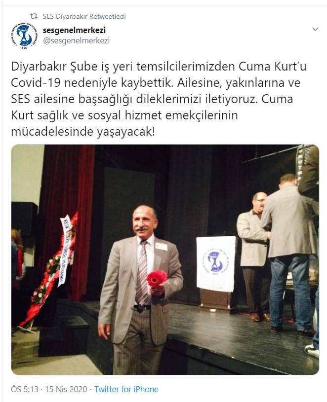 SES Genel Merkezi, SES Diyarbakır Şubesi eski yöneticilerinden Cuma Kurt’un (57) koronavirüs nedeniyle yaşamını yitirdiğini duyurdu. SES tarafından yapılan açıklamada, “Diyarbakır Şube iş yeri temsilcilerimizden Cuma Kurt’u Covid-19 nedeniyle kaybettik. Ailesine, yakınlarına ve SES ailesine başsağlığı dileklerimizi iletiyoruz. Cuma Kurt sağlık ve sosyal hizmet emekçilerinin mücadelesinde yaşayacak!” denildi.