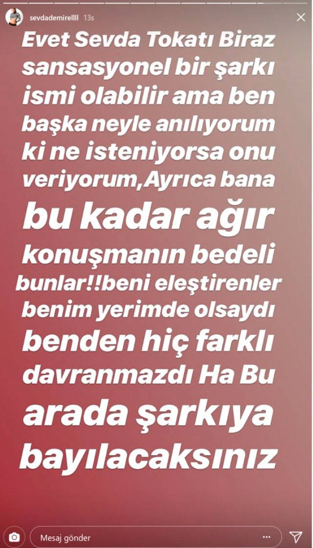 "Sevda Tokadı" adını verdiği bir şarkı çıkaran Sevda Demirel, ilk olarak bu şarkısıyla ilgili bir açıklamada bulundu. Demirel, sosyal medya hesabından, ''Evet Sevda Tokat'ı biraz sansasyonel bir şarkı ismi olabilir ama ben başka neyle anılıyorum ki ne isteniyorsa onu veriyorum. Ayrıca bana bu kadar ağır konuşmanın bedeli bunlar!! Beni eleştirenler benim yerimde olsaydı benden hiç farklı davranmazdı. Ha bu arada şarkıya bayılacaksınız'' notunu paylaştı.