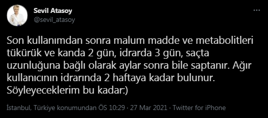Kokainin vücuttan atılma süresine ilişkin bir paylaşım yapan Atasoy, “Son kullanımdan sonra malum madde ve metabolitleri tükürük ve kanda 2 gün, idrarda 3 gün, saçta uzunluğuna bağlı olarak aylar sonra bile saptanır. Ağır kullanıcının idrarında 2 haftaya kadar bulunur. Söyleyeceklerim bu kadar” ifadelerini kullandı.