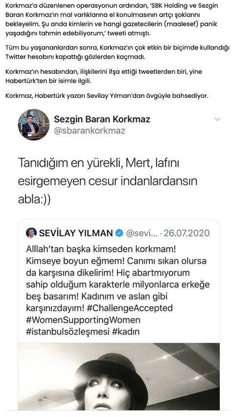 HaberTürk yazarı Sevilay Yılman, bugünkü yazısında, organize suç örgütü lideri Sedat Peker'in videolarında ismi geçen SBK Holding'in sahibi Sezgin Baran Korkmaz ile iki yıl önce arkadaşlarıyla yemek için gittiği bir mekanda AKP'li bir milletvekilinin sayesinde tanıştığını yazdı. Yılman hakkındaki tweet'e ve Korkmaz ile olan iletişimine ilişkin açıklama yaptı.