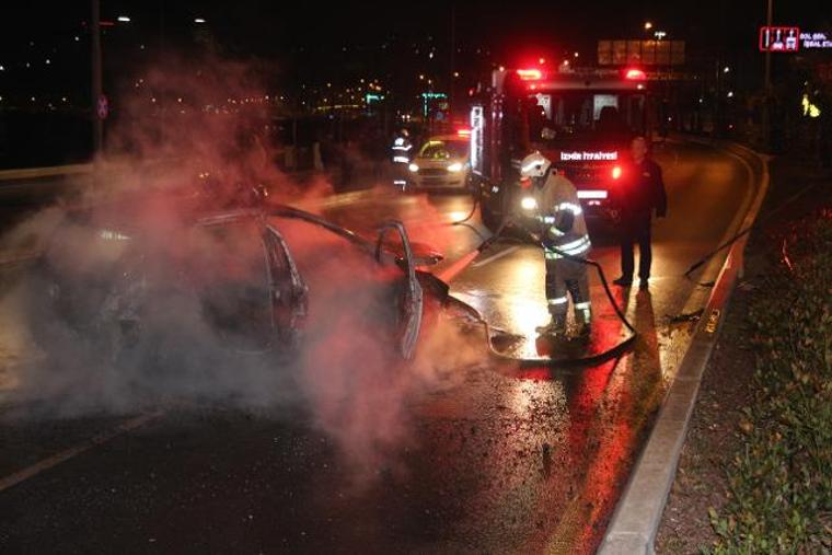 İzmir’de seyir halinde alev alan araç kısa sürede alevlere teslim oldu. Alevlere teslim olan araç kullanılamaz hale geldi.