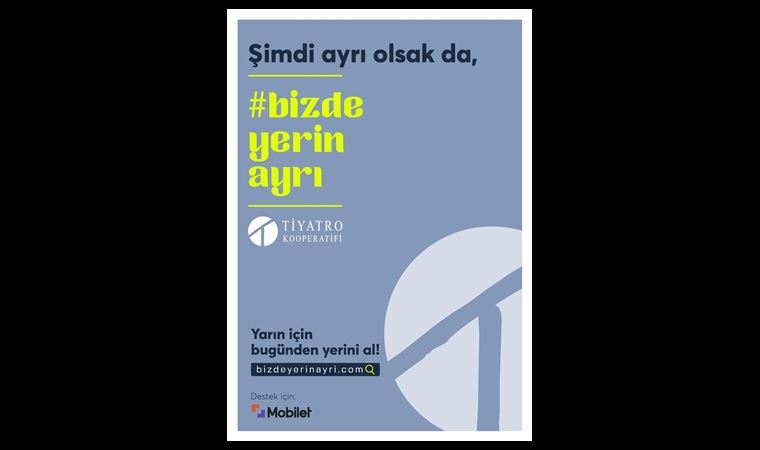 #BizdeYerinAyrı seyirci destek programı tüm tiyatroseverleri özel tiyatrolar için dayanışmaya çağırıyor! COVID-19 salgını nedeniyle bütün gelirleri kesilen ve zor günler geçiren özel tiyatrolara katkı sağlanabilmesi için Tiyatro Kooperatifi tarafından, #BizdeYerinAyrı başlığı altında bir seyirci destek programı başlatıldı. “Şimdi ayrı olsak da #BizdeYerinAyrı” sloganıyla tiyatroların seyircilerine olan özlemini dile getiren destek programına katılım sağlayan tiyatroseverler, yeni sezonda tiyatrolarda yerlerini önden alarak bugünden tiyatroların, tiyatro oyuncularının ve tiyatro emekçilerinin yanında olabilecek. Değişik şeçenekler halinde hazırlanan destek programının paketlerine mobilet.com sitesinden erişilebiliyor.