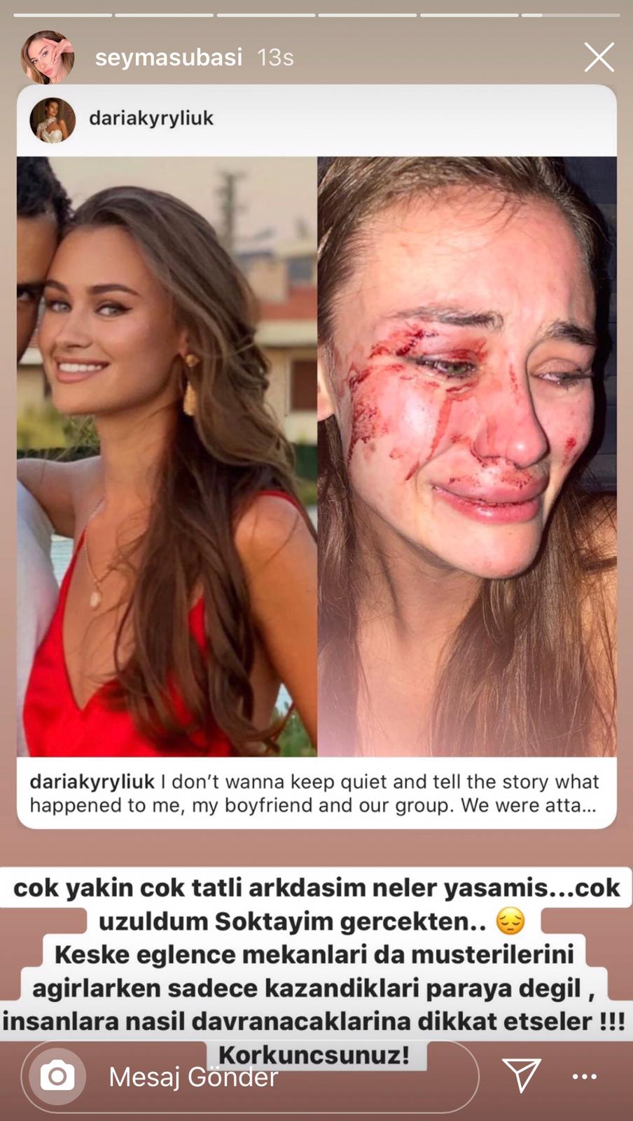 Ukraynalı model Daria Kyryliuk ve arkadaşları, iddiaya göre dün Çeşme Dalyan’da bulunan Momo Beach adlı turistik mekânın güvenlik görevlileri tarafından darp edildi. Kyryliuk’un darp sonrası fotoğraflarını paylaşmasının ardından magazin figürü Şeyma Subaşı da arkadaşı Daria’ya uygulandığı iddia edilen şiddet için Instagram hesabından “Korkunçsunuz” notuyla bir hikâye paylaştı.