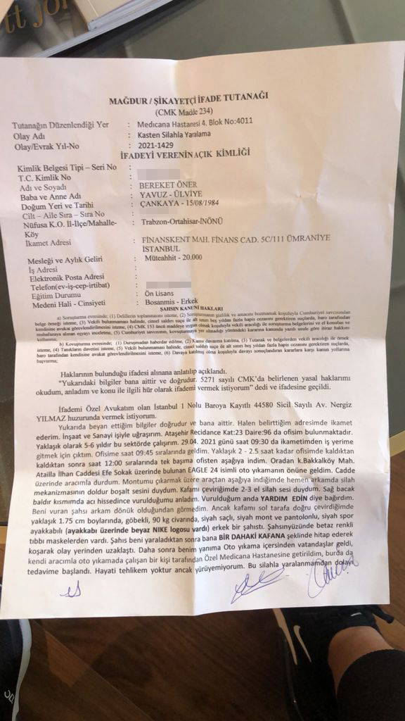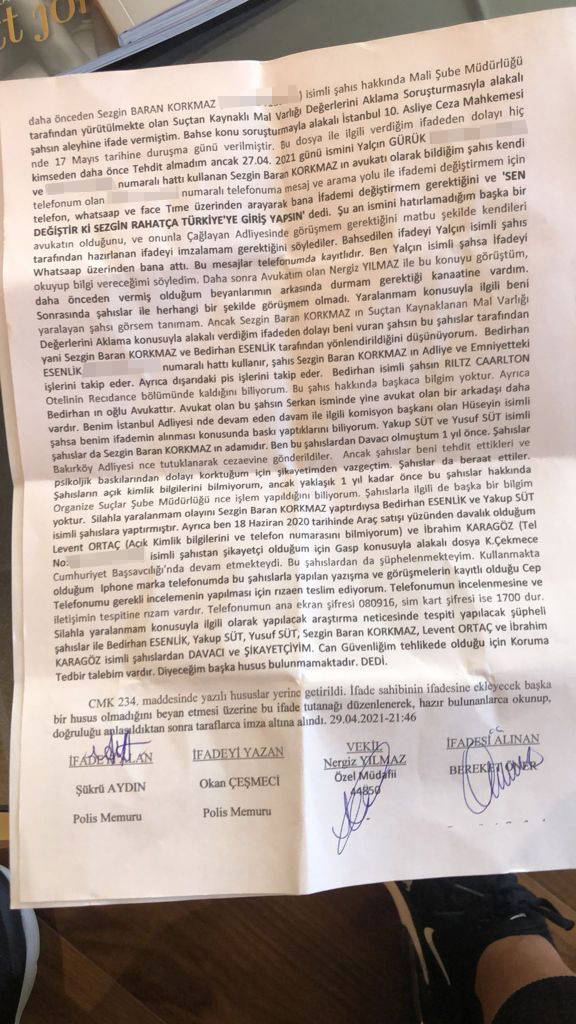 “Bu saldırıdan önce Sezgin Baran Korkmaz isimli şahıs hakkında Mali Şube Müdürlüğü tarafından yürütülmekte olan suçtan kaynaklı ‘Mal Varlığı Değerlerini Soruşturma’yla ilgili şahsın aleyhine ifade vermiştim. Bahse konu soruşturmayla alakalı İstanbul 10. Asliye Ceza Mahkemesi’nde 17 Mayıs günü duruşma tarihi verilmiştir. Bu dosya ile ilgili verdiğim ifadeden dolayı hiç kimseden daha önce tehdit almadım. Ancak 27.04.2021 günü ismini Yalçın Gürük, 0532597... numaralı hattı kullanan Sezgin Baran Korkmaz’ın avukatı olarak bildiğim şahıs kendi telefonum olan 0542 278... numaralı telefonuma mesaj ve arama yolu ile ifademi değiştirmem için telefon, WhatsApp ve facetime üzerinden arayarak ifademi değiştirmem gerektiğini ve ‘Sen değiştir ki Sezgin rahatça Türkiye’ye giriş yapsın’ dedi. Şu an ismini hatırlamadığım başka bir avukatın olduğunu ve onunla Çağlayan Adliyesi’nde görüşmem gerektiğini, matbu şeklinde kendileri tarafından hazırlanan ifadeyi imzalamam gerektiğini söylediler. Bahsedilen ifadeyi Yalçın isimli şahıs WhatsApp üzerinden bana attı. Bu mesajlar telefonumda kayıtlıdır. Ben Yalçın isimli şahsa ifadeyi okuyup bilgi vereceğimi söyledim. Daha sonra avukatım olan Nergiz Yılmaz ile bu konuyu görüştüm ve daha önceden vermiş olduğum beyanlarımın arkasında durmam gerektiği kanaatine vardım. Sonrasında şahıslarla herhangi bir görüşmem olmadı. Ancak Sezgin Baran Korkmaz’ın suçtan kaynaklanan Mal Varlığı Değerlerini Aklama konusuyla alakalı verdiğim ifadeden dolayı beni vuran şahsın bu şahıslar tarafından, yani Sezgin Baran Korkmaz ve Bedirhan Esenlik tarafından yönlendirildiğini düşünüyorum. Bedirhan Esenlik, 0532 222... numaralı hattı kullanır. Şahıs, Sezgin Baran Korkmaz’ın adliye ve Emniyet’teki işlerini takip eder. Ayrıca dışarıdaki pis işlerini takip eder. Bedirhan isimli şahsın Ritz Carlton Oteli’nin Recidance bölümünde kaldığını biliyorum. Bu şahıs hakkında başka bilgim yoktur. Ayrıca Bedirhan’ın oğlu da avukattır ve avukat olan bu şahsın Serkan isminde yine avukat olan bir arkadaşı daha vardır. Benim İstanbul Adliyesi’nde devam eden davam ile ilgili komisyon başkanı olan Hüseyin isimli şahsa benim ifademin alınması konusunda baskı yaptıklarını biliyorum. Yakup Süt ve Yusuf Süt isimli şahıslar da Sezgin Baran Korkmaz’ın adamıdır. Ben bu şahıslardan bir yıl davacı olmuştum. Şahıslar Bakırköy Adliyesi’nce tutuklanarak cezaevine gönderildiler. Ancak şahıslar beni tehdit ettikleri ve psikolojik baskılardan dolayı korktuğum için şikayetimden vazgeçtim. Şahıslar da beraat ettiler. Silahla yaralanmam olayını Sezgin Baran Korkmaz yaptırdıysa Bedirhan Esenlik ve Yakup Süt yoktur isimli şahıslara yaptırmıştır."