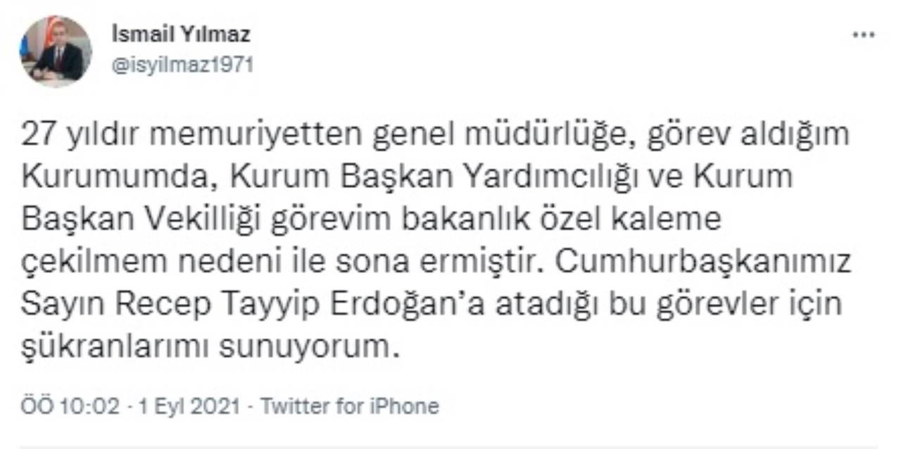 SGK Başkan Vekilliği'ne 2 Ocak 2020 tarihinde atanan İsmail Yılmaz, 20 aydır yürüttüğü bu görevden alınarak Çalışma ve Sosyal Güvenlik Bakanlığı özel kalem emrine verildi.