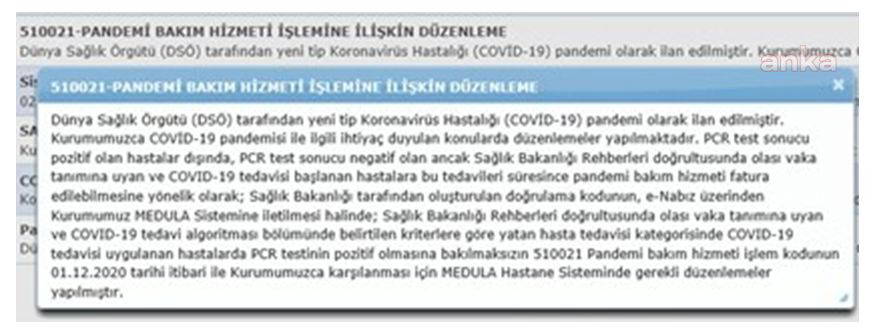 “PCR test sonucu pozitif olan hastalar dışında, PCR test sonucu negatif olan ancak Sağlık Bakanlığı Rehberleri doğrultusunda olası vaka tanımına uyan ve COVID-19 tedavisi başlanan hastalara bu tedavileri suresince pandemi bakım ücreti fatura edilebilmesine yönelik olarak; Sağlık Bakanlığı tarafından oluşturulan doğrulama kodunun, e-Nabız üzerinden Kurumumuz MEDULA Sistemine iletilmesi halinde; Sağlık Bakanlığı Rehberleri doğrultusunda olası vaka tanımına uyan ve COVID-19 tedavi algoritması bölümünde belirtilen kriterlere göre yatan hasta tedavisi kategorisinde COVİD-19 tedavisi uygulanan hastalarda PCR testinin pozitif olmasına bakılmaksızın 510021 Pandemi bakım hizmeti işlemi kodunun 1 Aralık 2020 tarihi itibari ile Kurumumuzca karşılanması için MEDULA Hastane Sisteminde gerekli düzenlemeler yapıldı.”