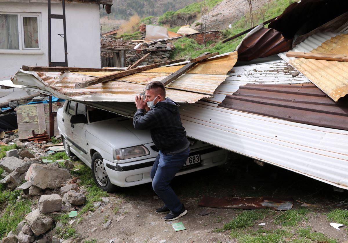 Uçan çatının arabasının üzerine düştüğünü belirten Mustafa Yalçın, özel sektörde asgari ücretle çalışan bir eleman olduğunu ifade ederek, "Komşularım kapımı çaldı ve 'arabanın üzerine sac devrildi' dedi. Şu gördüğünüz evin; iki ev arkasından yıkılma kararı verilen evin sacı, çatının sacı rüzgar nedeniyle kalkıyor geliyor, komşumun enerji sistemini parçalıyor. Benim taksimin üzerine düşüyor.